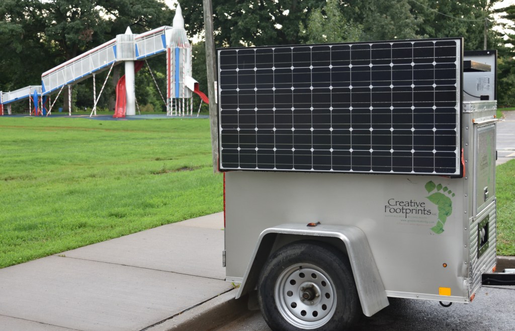 We gathered in the park’s shelter and introduced ourselves to the gathered group. Then had our first meal together. We learned about the gear truck, a large rented box truck with shelves that had been built against one side to hold our gear between campsites. We also learned about the solar panel/battery system that would provide electricity at our stops. Last but not least, we learned about the “shit, shower and shave” shed on wheels that had two compost toilets and two solar showers.
