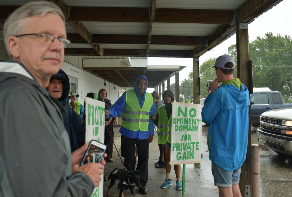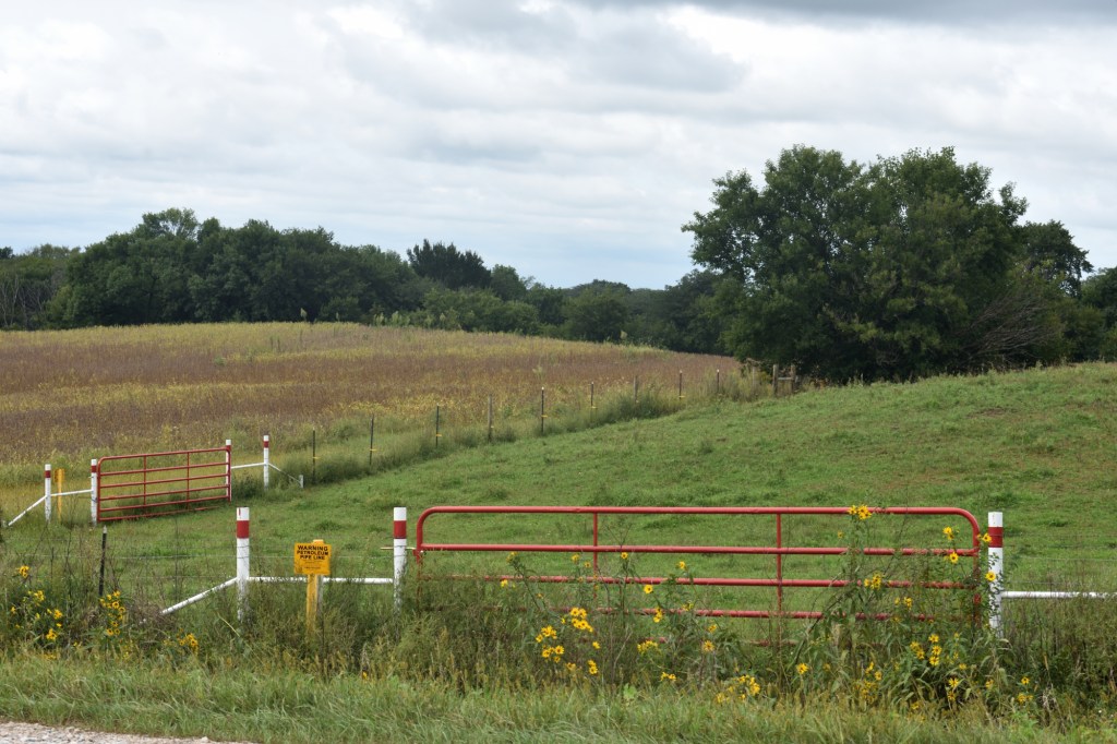 Before crossing the river just before reaching our destination of Pilot Mound, we came to another pipeline crossing. We could see the area where trees had been removed to build the pipeline on the hill on the other side of the river.