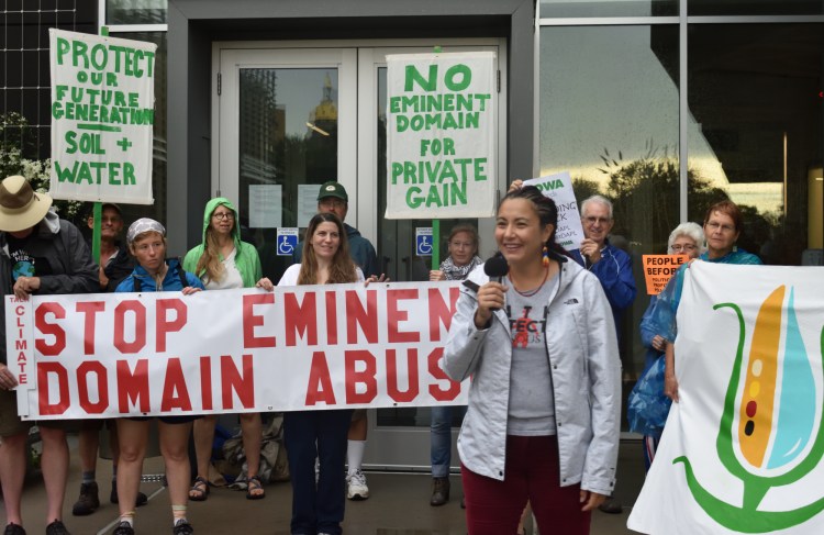 Tsosie’s remarks came as a group gathered outside the Iowa Utilities Board office early Saturday morning for a short pre-march meeting. Some in attendance held large signs with messages including “Stop eminent domain abuse” and “Protect our future generation soil and water.”